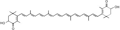 Astaxanthin, zur Gruppe der Xanthophylle gehörender roter Farbstoff, der im Tierreich, insbesondere bei Krebstieren (Crustacea) und Stachelhäutern (Echinodermata), aber z.B. auch in der Beinhaut des Flamingos vorkommt. Durch Algen produziertes A. hat u.a. bei der Färbung von Lachsfleisch wirtschaftliche Bedeutung. Nativ liegt A. entweder in freier Form als roter Farbstoff ( vgl. Abb. ), als Ester oder als blaues, grünes oder braunes Chromoprotein vor. Der im Panzer des Hummers enthaltene intensiv blauschwarze Farbstoff (Crustacyanin) besteht aus einem Astaxanthin-Protein-Komplex, aus dem bei Denaturierung des Proteins beim Kochen das A. freigesetzt und zum ebenfalls roten Astacin oxidiert wird.