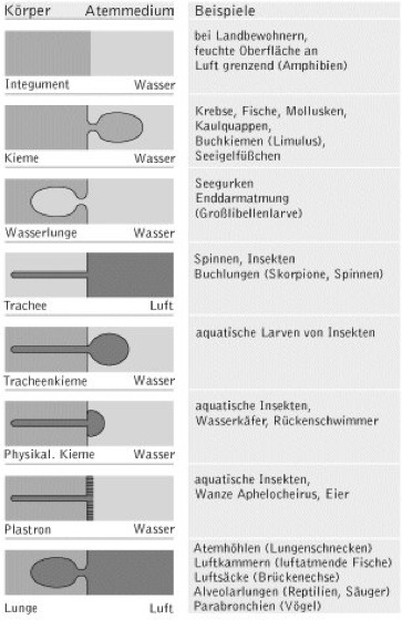 Atmungsorgane, Respirationsorgane, mehr oder weniger spezialisierte Körperpartien wasser- und landbewohnender Tiere, die dem Transport von Sauerstoff (O2) an eine respiratorische Oberfläche und der Abgabe des im Zellstoffwechsel gebildeten Kohlenstoffdioxids (CO2) an das umgebende Medium dienen ( vgl. Abb. ). Vor allem bei Tieren mit einer im Verhältnis zum Körpervolumen großen Oberfläche sowie solchen mit geringer Stoffwechselintensität dient die gesamte Körperoberfläche als Oberfläche für den Gasaustausch (Hautatmung). Bei den Oligochaeta, den Echinodermata, Wasserinsekten und den Fischen gibt es Arten mit Darmatmung. So erzeugt der Schlammröhrenwurm Tubifex insbesondere bei reduziertem O2-Angebot wellenförmige Bewegungen mit seinem aus dem Schlamm herausragenden Hinterende und nimmt O2-reiches Wasser in seinen Darm auf. Verschiedene Fische schlucken Luft und geben sie nach dem Gaswechsel im Mitteldarm durch den After wieder ab. Seewalzen (Holothuroidea) besitzen als fein verästelte Ausstülpungen des Enddarms so genannte Wasserlungen, durch die Wasser, das über die Kloake aufgenommen wurde, mittels Kontraktionen von Ringmuskulatur gepresst wird.