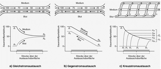 Atmungsorgane:Funktionelle Anordnung von Atmungsorganen. Ähnlich wie bei Exkretionsorganen lässt sich die Vielfalt der morphologischen Ausbildungen von A. auf wenige Grundtypen zurückführen. Sie unterscheiden sich in der Art des Gasaustausches zwischen Blut und Atemmedium über respiratorische Membranen. Nach ihrer Leistungsfähigkeit – d.h. der Fähigkeit, Blut mit Sauerstoff anzureichern und Kohlenstoffdioxid anzugeben – sind dies: Offene Systeme (Hautatmung), Pool- und Gleichstromsysteme (Alveolarlungen der Säuger), Kreuzstromsysteme (Parabronchiallungen der Vögel und das Gasauschtauschsystem in der Placenta und Gegenstromsysteme (Kiemen der Fische). – Hautatmung ist wenig effizient, da Ventilationseinrichtungen fehlen. Beim Gleichstromaustauscher (a) trifft sauerstoffarmes Blut (px) zunächst auf frisches Atemmedium (pi). Während Blut und Medium parallel über die Austauschfläche strömen, erreichen die Sauerstoffpartialdrücke ein Gleichgewicht, das zwischen pi und px liegt. Der Sauerstoffpartialdruck des Blutes, das den Austauscher verlässt (pa) kann in diesem System nicht über dem des ausgeatmeten Mediums (pe) liegen. – Beim Gegenstromaustauscher (b) trifft sauerstoffarmes Blut px zunächst auf sauerstoffarmes Medium (pe). Im Verlauf des Gasaustausches über der respiratorischen Oberfläche gelangt das Blut in Kontakt mit zunehmend sauerstoffreicherem Medium. Auf diese Weise wird ständig eine Sauerstoffpartialdruckdifferenz aufrecht erhalten, die die weitere Aufnahme von Sauerstoff aus dem Medium fördert. Wenn das Blut den Austauscher verlässt (pa), hat es einen wesentlich höheren Sauerstoffpartialdruck als das ausgeatmete Medium; er kann nahe dem des eingeatmeten Mediums (pi) liegen. – Im Falle des Kreuzstromaustauschers (c) trifft ein Teil des Blutes ausschließlich auf sauerstoffreiches Medium, ein anderer Teil auf sauerstoffärmeres bis sauerstoffarmes Medium. Da die kleinen Gefäße, die den Medienstrom queren, sich wieder zu einem Gefäß vereinigen, verlässt das letztere den Austauscher mit Blut, dessen Sauerstoffpartialdruck zwar deutlich über dem von pe liegt, der sich aber nicht so stark an pi annähern kann wie im Fall des Gegenstromaustauschers