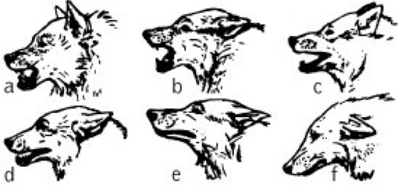 Ausdrucksverhalten: Ausdrucksstudien am Wolf: a Drohung, b Drohung mit Unsicherheit, c Drohung sehr schwach, d Drohung schwach – Unsicherheit sehr stark, e Ängstlichkeit – Schmerzschrei-Situation, f Feind gegenüber – Abwehr, Unsicherheit, Unterlegenheit