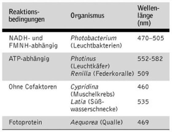 Biolumineszenz, Ausstrahlung von sichtbarem Licht ohne Temperaturänderung (so genanntes „kaltes Leuchten“) durch lebende Organismen (Leuchtorganismen). Das Prinzip der Leuchtvorgänge beruht auf einer Oxidation bestimmter Leuchtstoffe, der Luciferine (Luciferin-Luciferase-System), in Anwesenheit des Enzyms Luciferase, das diese Reaktion katalysiert. Die meisten Bakterien, die B. aufweisen (Leuchtbakterien), gehören zur Gatt. Photobacterium und sind für das Leuchten von frischem Fleisch und Fisch verantwortlich. Zur Induktion der Luciferase bei Leuchtbakterien ist interessanterweise eine bestimmte Populationsdichte erforderlich. Frei lebende Leuchtbakterien leuchten daher nicht. B. bei Protozoen tritt auf bei Peridineen, die das Meeresleuchten verursachen. Bei Pilzen ist besonders der Hallimasch (Armillaria mellea) mit seinem leuchtenden Mycel bekannt. Zu den Landtieren, die B. aufweisen, gehören u.a. Leuchtkäfer („Glühwürmchen“, Lampyris noctiluca), Tausendfüßer und Schnecken. Bei marinen Tieren beruht die B. oft auf einer Symbiose mit leuchtenden Bakterien (sekundäre B.), z.B. bei Tintenschnecken, Feuerwalzen und Tiefseefischen (Tiefsee). Das Leuchten kann in speziellen Leuchtzellen in einzelnen Leuchtgranula, in Leuchtgeweben oder in Leuchtorganen lokalisiert sein. Die biologische Funktion der B. ist in vielen Fällen unbekannt. Bei einigen Arten dient sie zur Erkennung von Artgenossen, bei anderen zur Anlockung des Sexualpartners (Glühwürmchen) oder zum Aufspüren von Beute.