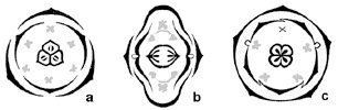 Blütendiagramm:a Tulpe, radiär; b Flammendes Herz, bilateral; c Taubnessel, dorsiventral. (a und b empirische Diagramme, c theoretisches Diagramm)