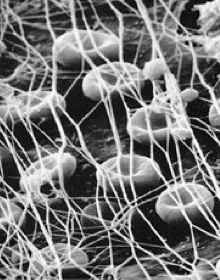Blutgerinnung: Rasterelektronenmikroskopische Aufnahme der Ausbildung eines Fibrinnetzes auf den Endothelzellen, ein Prozess, der letztendlich zur Bildung des roten Abscheidungsthrombus führt. Die eingedellten Zellen sind Erythrocyten