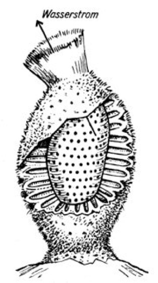Calcarea: Habitus von Sycon spec. Die Körperwand ist teilweise entfernt und gibt den Blick in den Zentralraum (Atrium) frei. Das Wasser strömt durch zahlreiche Poren der Körperwand ein, wird durch Kragengeißelkammern filtiriert und strömt über das Atrium und das Osculum wieder nach außen