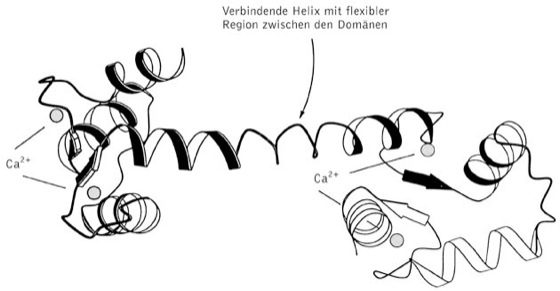 Calmodulin, in tierischen und pflanzlichen Zellen vorkommendes, Ca2+-bindendes Protein, auf dessen Wirkung die Ca2+-abhängige Regulation einer Reihe von Enzymen (insbesondere Proteinkinasen) sowie von Ionenpumpen und Cytoskelett-Komponenten beruht ( vgl. Tab. ). C. besteht aus 148 Aminosäuren und besitzt vier hochaffine Bindungsstellen für Ca2+, sodass die Bindung von Ca2+ an C. hochspezifisch ist ( vgl. Abb. ).