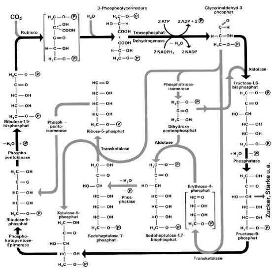 Der C. gliedert sich in drei als Carboxylierung, Reduktion und Regeneration bezeichnete Abschnitte ( vgl. Abb. ). Dabei wird durch das Enzym Ribulose-1,5-bisphosphat-Carboxylase/Oxygenase („Rubisco“) zunächst ein CO2-Molekül kovalent an den CO2-Akzeptor Ribulose-1,5-bisphosphat gebunden, wobei ein Enzym gebundenes Intermediat entsteht, das nach Hydrolyse zwei Moleküle 3-Phosphoglycerat bildet. Das 3-Phosphoglycerat wird anschließend unter Verbrauch von ATP und NADPH zu Glycerinaldehyd-3-phosphat reduziert, das wiederum durch eine Reihe von Enzymen der Biosynthese von Kohlenhydraten (Stärke, Saccharose) sowie der Regeneration von neuem Ribulose-1,5-bisphosphat dient. Der letzte Abschnitt des C., bei dem aus fünf Molekülen Triosephosphat drei Moleküle Pentosephosphat entstehen, ermöglicht erst eine kontinuierliche CO2-Fixierung. Im Gleichgewichtszustand dienen fünf Sechstel der Triosephosphate der Regeneration und ein Fünftel wird in das Cytosol exportiert, wo es zu Saccharose und anderen Metaboliten umgewandelt wird. Die Nettobilanz des C. lautet deshalb, dass für die Synthese eines Hexosemoleküls 6 Moleküle CO2 unter Verbrauch von 18 ATP und 12 NADPH fixiert werden müssen ( vgl. Abb. ).