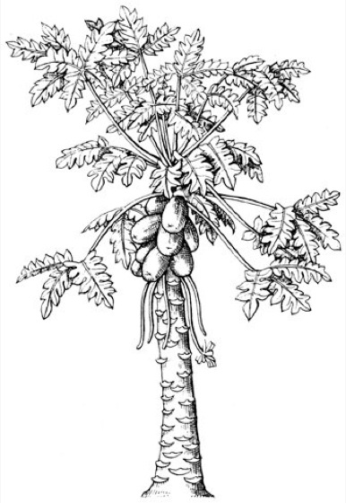 Caricaceae, Melonenbaumgewächse, Fam. der Caricales mit ca. 30 Arten, die in den Tropen verbreitet sind. Es sind kleine, Milchsaft führende Bäume mit lang gestielten, einfachen oder gefingerten Blättern. Der i.d.R. fünffächerige Fruchtknoten entwickelt sich zu einer großen, fleischigen Beere. Überall in den Tropen wird der Melonenbaum, Carica papaya, kultiviert ( vgl. Abb. ).