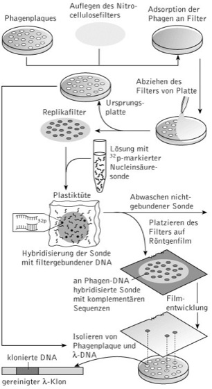 cDNA-Bibliothek: Screening einer cDNA-Bibliothek. Durch die Kolonie-Hybridisierung werden Klone, die mit der radioaktiv markierten Gensonde durch komplementäre Basenpaarung wechselwirken, als Signal auf einem Röntgenfilm identifiziert. Die genaue Lage des Nitrocellulosefilters auf den Agarplatten wird markiert, sodass die positiven Phagenplaques auf der Ursprungsplatte mit Hilfe des Autoradiogramms lokalisiert werden können
