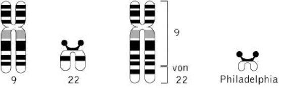 Chromosomenmutationen: Gezeigt ist eine Translokation zwischen den menschlichen Chromosomen 9 und 22 (links), die die Ursache für eine Form von Leukämie darstellt. Als Ergebnis ist ein Teil des langen Arms von Chromosom 22 auf Chromosom 9 transloziert. Das Restchromosom 22 wird als Philadelphia-Chromosom bezeichnet