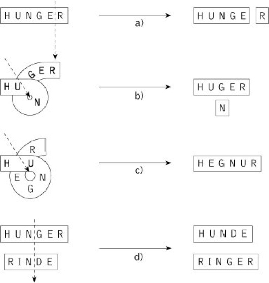 Chromosomenmutationen: Typische Formen sind a Defizienz (Verlust eines Endstücks), b Deletion (Verlust eines Zwischenstücks), c Inversion (intrachromosomale Umlagerung) und d Translokation (interchromosomale Umlagerung). Die Auswirkungen auf das Leseraster werden durch die eingezeichneten Worte angedeutet