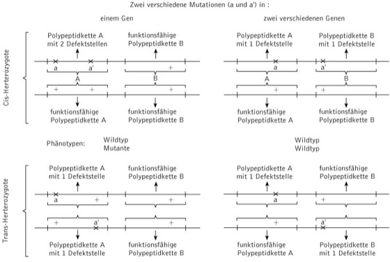 Zwei voneinander unabhängig eingetretene Punktmutationen a und a´ können entweder an zwei unterschiedlichen Stellen innerhalb eines Gens liegen (z.B. A), oder sie liegen in zwei verschiedenen Genen (z.B. A und B). Für den Fall, dass durch die beiden Mutationen nur ein Gen betroffen ist, wird in der cis-Heterozygoten der normale Phänotyp ausgeprägt, da auf dem nicht betroffenen homologen Chromosom die Funktion A und das durch sie codierte Merkmal unverändert bleibt. Die trans-Heterozygote bringt allerdings einen veränderten Phänotyp hervor, da auf beiden homologen Chromosomen die Ausprägung von Funktion A defekt ist. ( vgl. Abb. )