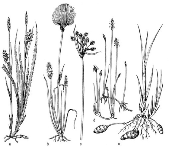 Cyperaceae:a Behaarte Segge (Carex hirta), b Scheidiges Wollgras (Eriophorum vaginatum), c Teichsimse (Scirpus), d Gemeines Sumpfried (Eleocharis palustris), e Erdmandel (Cyperus esculentus)