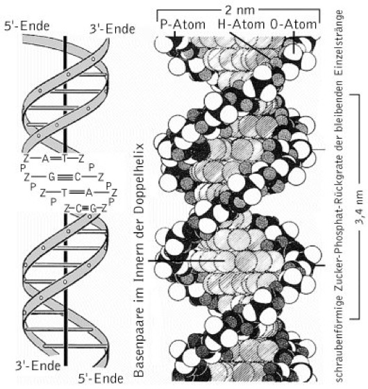 Die ursprünglich durch J. Watson und F. Crick beschriebene Doppelhelix wird inzwischen als so genannte B-Form bezeichnet und unterscheidet sich von weiteren Formen (A-Form, Z-DNA, P-Form) in der Anzahl der Basenpaare pro Windung, dem helikalen Durchmesser und darin, ob sie rechts- oder linksgedreht sind ( vgl. Abb. ). Inwieweit diese durch die Wahl der physikalischen Bedingungen wie Wassergehalt, Vorhandensein bestimmter Ionen oder eine hohe Ionenstärke entstehenden Formen in vivo vorkommen, ist unklar. So kommt die linksgängige Z-DNA (benannt nach den im Zickzack verlaufenden Phosphatgruppen) auch innerhalb der B-Form vor; sie könnte an der Genregulation beteiligt sein oder die im Verlauf der Transkription von der RNA-Polymerase erzeugte negative Torsionsspannung stabilisieren. Torsionsspannungen treten in allen DNA-Molekülen auf, die wie virale, bakterielle und eukaryotische DNA keine freien Enden aufweisen, da sie als ringförmige Moleküle oder aber in Chromosomen organisiert sind. Dadurch kann die DNA nicht mehr frei im Raum drehen, wodurch es zu einer Superspiralisierung (supercoil) kommt. Für die Auflösung dieser Strukturen sind die DNA-Topoisomerasen und DNA-Helicasen verantwortlich.