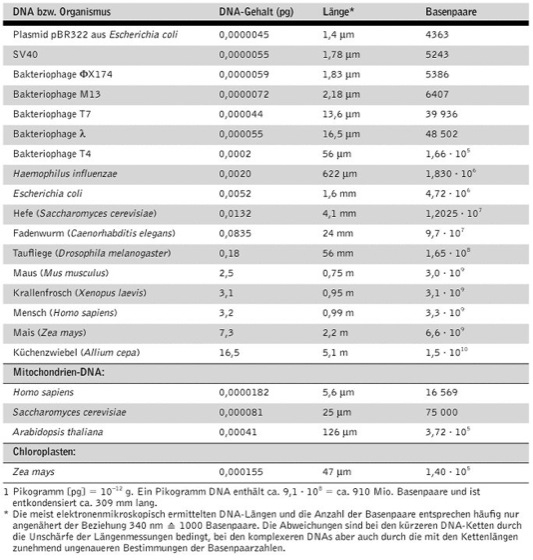 Desoxyribonucleinsäure, Abk.: DNA, DNS, ein langes Polymer, das i.d.R. aus den vier Nucleotiden Adenosinmonophosphat, Cytidinmonophosphat, Guanosinmonophosphat und Thymidinmonophosphat als Grundbausteinen besteht, und, von RNA-Viren und RNA-Bakteriophagen abgesehen, in allen Zellen als Träger der genetischen Information fungiert. Dort kommt die DNA überwiegend in den Chromosomen (Chromatin, Eucyte) oder chromosomenähnlichen Strukturen der Protocyte (Bakterienchromosom) vor. Jedes Chromatid eines Chromosoms besteht aus einem DNA-Doppelstrang. Extrachromosomal ist DNA in den Mitochondrien (Chondrom) und Plastiden (Plastom) bzw. als Plasmide vorhanden. Was die Größe einzelner DNA-Moleküle anbelangt, unterscheiden sich die mehrere Tausend Basenpaare großen Plasmide, Phagen-DNAs und Genome der Organellen von den aus vielen Millionen Basenpaaren bestehenden DNA-Strängen eukaryotischer Organismen ( vgl. Tab. ). Die DNA liegt fast immer doppelsträngig als Doppelhelix vor, bei der die beiden DNA-Stränge antiparallel zueinander verlaufen. Lediglich eine Reihe von Bakteriophagen und Viren besteht aus einzelsträngiger DNA.