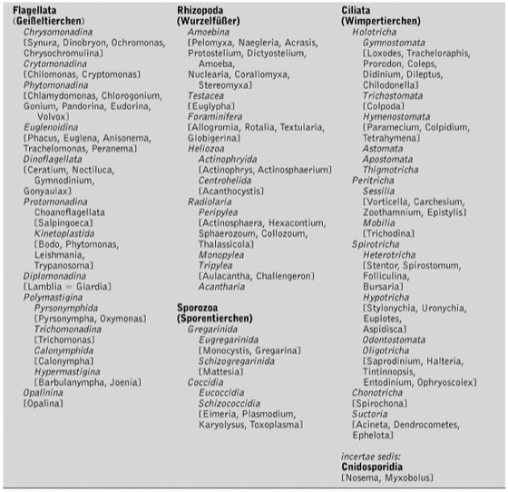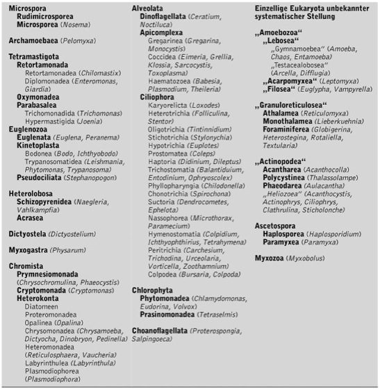 Systematik: Für die Stammart der Eukaryota wird ein E. angenommen, aus dem alle anderen Protisten und auch Metazoa, Pilze und Pflanzen hervorgegangen sind. Diese Stammart besaß bereits ein hoch differenziertes Membransystem, das neben rauem und glattem ER auch die Kernhülle mit umfasst. Auch ist anzunehmen, dass Chromosomen und ein mitotischer Teilungsapparat aus Mikrotubuli und Mikrofilamentsystemen zur Durchführung von Zellteilungen und Zellbewegungen sowie 70 S-Ribosomen vorhanden waren. Gefehlt haben der Stammart noch Flagellen, eventuell Mitochondrien oder Hydrogenosomen sowie Dictyosomen mit mehr als drei Zisternen. Unter Berücksichtigung der Verwandtschaft ist eine Unterscheidung von Pflanzen und Tieren innerhalb der Einzeller hinfällig, da sich die Entstehung von fototrophen Organismen („Pflanzen“) durch den Erwerb von Plastiden (Endosymbiontentheorie) mit großer Wahrscheinlichkeit mehrfach ereignet hat; auch werden die einzelligen Pilze den E. zugeordnet. Zudem führte die herkömmliche Trennung in einzellige Tiere (Protozoa) und einzellige Pflanzen (Protophyta) dazu, dass eine Grenze zwischen Tier- und Pflanzenreich gebildet wird, die mitten durch die Gruppe der Flagellata geht und zur Unterscheidung von Phytoflagellata und Zooflagellata führt. Auch müsste z.B. der Malaria-Erreger (Plasmodium) zu den Pflanzen gezählt werden, weil er auf einen Organismus mit ehemals Plastiden zurückgeht. Von der herkömmlichen Einteilung der „Protozoa“ in Geißeltierchen (Flagellata), Wurzelfüßer (Rhizopoda), Sporentierchen (Sporozoa) und Wimpertierchen (Ciliata), bleiben nur die beiden letztgenannten unter den Namen Apicomplexa bzw. Ciliophora in etwa bestehen ( vgl. Tab. ). Die Begriffe „Flagellaten“ und „Amöben“ sind nur zur lebensformtypischen Charakterisierung verschiedener, nicht näher verwandter Gruppen weiterhin geeignet.
