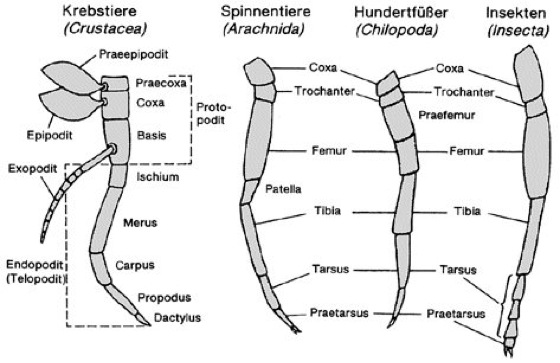 Extremitäten: Gliederung des Endopoditen und Benennung der Einzelteile bei den Gruppen der Gliederfüßer (Arthropoda)
