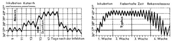 Fieber: Die typischen Fieberkurven bei Masern (links) und Typhus (rechts)