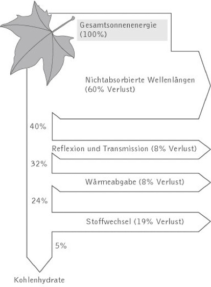 Fotosynthese: Nur ein geringer Anteil der einstrahlenden Sonnenenergie wird im Blatt zur fotosynthetischen CO2-Fixierung verwendet. 95 % können nicht genutzt werden oder gehen anderweitig verloren