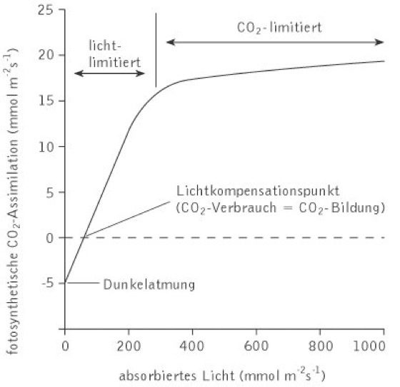 Fotosynthese: Abhängigkeit der Fotosynthese von der Beleuchtungsstärke am Beispiel einer C3-Pflanze. Während der Dunkelatmung kommt es zu einer Nettoproduktion von CO2, erst beim Erreichen einer bestimmten Beleuchtungsstärke wird CO2 in Form von Kohlenhydraten fixiert (Lichtkompensationspunkt). In Abhängigkeit von der einfallenden Lichtmenge ist die fotosynthetische CO2-Assimilation lichtlimitiert bzw. CO2-limitiert