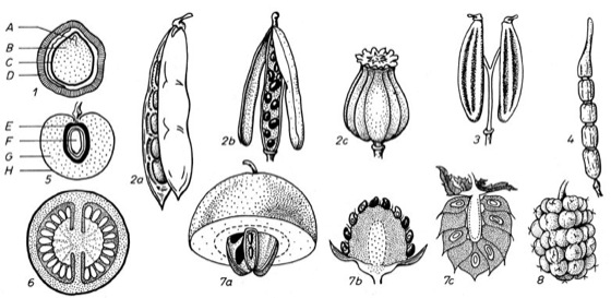 Frucht:1 Schließfrucht: Haselnuss (schematischer Längsschnitt); A Keimwurzel, B Keimblatt, C Samenschale, D Fruchtwand. 2a bis 2c Springfrucht: 2a Hülse der Feuerbohne, 2b Schote des Kohls, 2c Porenkapsel des Mohns. 3 Spaltfrucht: Doppelachäne des Kümmels. 4 Bruchfrucht: Gliederschote des Hederichs. 5 Steinfrucht: Kirsche (schematischer Längsschnitt): E Endokarp, F Same mit Keimling, G Mesokarp, H Exokarp. 6 Beere: Tomate (schematischer Querschnitt). 7a bis 7c Sammelfrucht: 7a Sammelbalgfrucht: Apfel; die Bälge (Kerngehäuse) zur Hälfte freigelegt, 7b Sammelnussfrucht; Erdbeere (schematischer Längsschnitt), 7c Sammelsteinfrucht; Himbeere (schematischer Längsschnitt). 8 Nussfruchtstand: Maulbeere