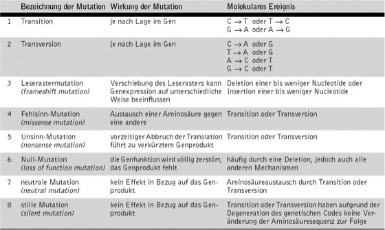 Punktmutationen: Hierbei handelt es sich um Veränderungen einzelner Basen, die untereinander ausgetauscht werden bzw. zusätzlich eingefügt oder aber fehlen können. Aufgrund der Degeneration des genetischen Codes führen Mutationen, bei denen das Leseraster erhalten bleibt, nicht unbedingt zu Aminosäureaustauschen bzw. zur Entstehung eines Stoppcodons. Mutationen, die hingegen zu Veränderungen im Leseraster führen, haben meist verheerende Folgen, indem ein völlig falsches Genprodukt gebildet oder die Genexpression frühzeitig beendet wird. ( vgl. Tab. )