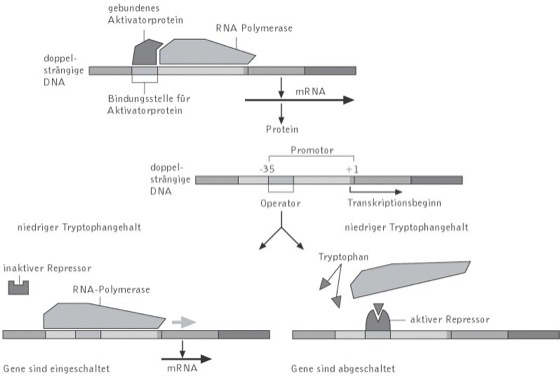 Bei Prokaryoten ( vgl. Abb. ) wurde die negative G. für die Gene der Zucker abbauenden Enzyme durch F. Jacob und J. Monod im Jahre 1961 vorgeschlagen (Lactose-Operon). Inzwischen ist das Jacob-Monod-Modell auch für eine Reihe anderer bakterieller Operons beschrieben worden (Arabinose-Operon, Tryptophan-Operon). Dabei binden Repressor-Proteine im Promotorbereich von negativ regulierten Genen und verhindern dadurch deren Transkription. Daneben können bei Prokaryoten im Rahmen einer positiven G. auch Aktivatorproteine wirksam werden, die die Transkription dadurch initiieren, dass sie die Affinität der RNA-Polymerase zum Promotor eines Gens erhöhen. Negative und positive G. schließen sich dabei nicht immer aus. So kann der CAP-cAMP-Komplex als übergeordneter Aktivator für eine Reihe von negativ regulierten Operons wirksam werden.