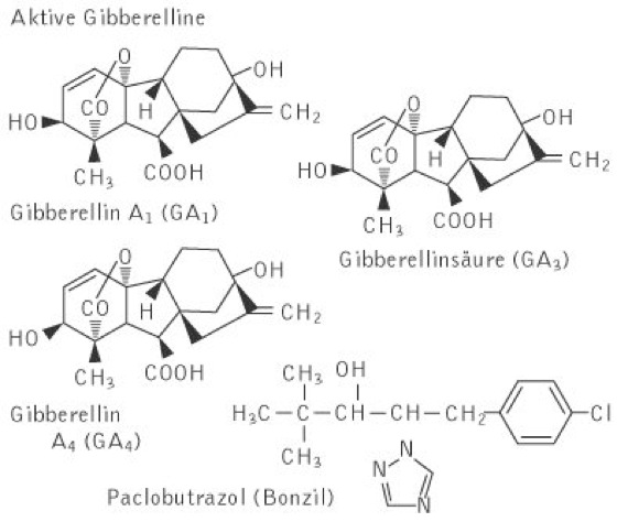 Gibberelline: Die Struktur von drei biologisch aktiven Gibberellinen und des Gibberellininhibitors Paclobutrazol
