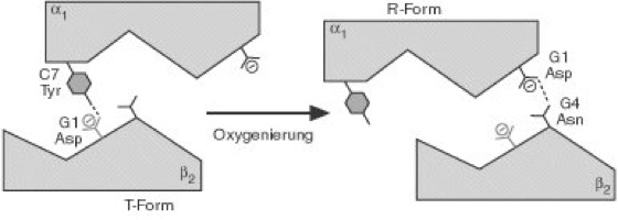 Hämoglobin: Bei der Oxygenierung geht das Hämoglobin bzw. der Kontakbereich von α1- und β2-Untereinheit von der T-Form in die R-Form über. Die Untereinheiten können aufgrund der so genannten Schwalbenschwanzgestalt leicht beide Formen einnehmen