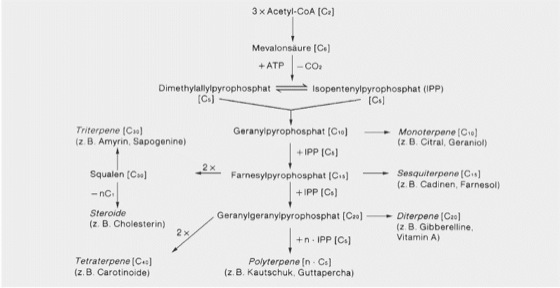 Isoprenoide: Biosynthese der Isoprenoide. Im Cytoplasma wird aus drei Molekülen Acetyl-CoA über Mevalonsäure 3-Isopentenylpyrophosphat (IPP, aktives Isopren) gebildet, das mit Dimethylallylpyrophosphat im Gleichgewicht steht (Mevalonat-Weg). Der weitere Biosyntheseweg beschränkt sich auf die für sie spezifischen Zellorganellen; z.B. erfolgt die Biosynthese von Sesquiterpenen und Steroiden (Triterpenen) im Cytoplasma, diejenige der isoprenen Seitenkette des Ubichinons in Mitochondrien und diejenige von Monoterpenen, Diterpenen und Tetraterpenen (Carotinoide) sowie der isoprenoiden Seitenketten der Chlorophylle, Plastochinone und Tocopherole in Plastiden.