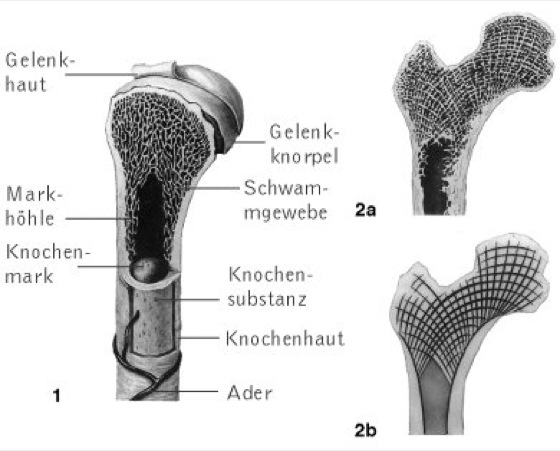 Knochen: Funktionelle Struktur eines Röhrenknochens. 1 Schnitt durch einen Röhrenknochen. 2a Schnitt durch das obere Ende des Oberschenkelknochens, dessen Knochenbälkchen in Radien und Bögen entsprechend den Belastungslinien (Trajektorien) angeordnet sind. 2b Schema der Belastungslinien