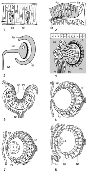Lichtsinnesorgane: Längsschnitte durch die Lichtsinnesorgane verschiedener Tiere. 1 Lichtsinneszellen in der Haut des Regenwurms (Annelida); 2 Flachauge einer Qualle (Coelenterata); 3 einfaches Becherauge (z.B. Lanzettfischchen, Acrania); 4 zusammengesetztes Becherauge (z.B. Turbellaria); 5 Grubenauge einer Napfschnecke (Archaeogastropoda); 6 einfaches Lochkameraauge bei niederen Tintenfischen (Cephalopoda); 7 Blasenauge einer Weinbergschnecke (Gastropoda); 8 Linsenauge bei höheren Tintenfischen. H Hornhaut, L Linse, Li Lid, Nf Nervenfasern, Pb Pigmentbecher, Pz Pigmentzellen, Sf Sehfarbstoff, Sts Stiftchen- (Mikrovilli-)Saum, Sz Sehzellen