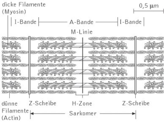 Aufbau des Skelettmuskels. Der Skelettmuskel besteht aus langen Muskelfaserbündeln, die sich meist über die gesamte Länge des Muskels erstrecken, und die aus parallelen Muskelfasern bestehen. Jede Muskelfaser ist eine einzige Zelle mit mehreren Zellkernen und durch Fusion mehrerer embryonaler Zellen entstanden. Sie enthält ein Bündel longitudinal angeordneter Myofibrillen, die aus zwei Arten von Myofilamenten gebildet werden: Dünnen Filamenten, die aus zwei Strängen des Proteins Actin und einem Strang des regulatorischen Proteins Tropomyosin bestehen, die umeinander gewickelt sind, sowie dicken Filamenten aus Myosin ( vgl. Abb. ). Unter dem Mikroskop ist die Myofibrille des Skelettmuskels quergestreift und jede dieser sich wiederholenden Einheiten ist eine funktionelle Grundeinheit des Muskels, die als Sarkomer bezeichnet wird. Die Actinfilamente sind in so genannten Z-Scheiben verankert und erstrecken sich in Richtung des Sarkomerzentrums. In dem auch, jeweils zwischen den Actinfilamenten, die dicken Myosinfilamente liegen. Im entspannten Zustand überlappen dünne und dicke Filamente nicht vollständig, und der hellere Bereich am Ende eines Sarkomers, in dem nur dünne Filamente liegen, wird als (hell erscheinende, isotrope) I-Bande bezeichnet. Die (dunkle, anisotrope) A-Bande ist der ausgedehnte Bereich, welcher der Länge der dicken Filamente entspricht. Da die dünnen Filamente nicht über die gesamte Länge des Sarkomers reichen, entsteht im Zentrum der A-Bande ein Bereich, in dem nur dicke Filamente liegen, die H-Zone. ( vgl. Abb. )