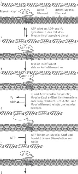 Mechanismus der Muskelkontraktion. Kontrahiert ein Muskel, verkürzt sich jedes Sarkomer, der Abstand von einer Z-Scheibe zur nächsten verkleinert sich, ebenso sind die I-Banden verkürzt und die H-Zone verschwindet. Eine Erklärung für diese Erscheinungen bietet die Gleitfilamenttheorie, nach der die dünnen und dicken Myofilamente während der Kontraktion in Längsrichtung aneinander vorbeigleiten, wobei sich ihr Überlappungsbereich vergrößert ( vgl. Abb. ). Dieses Gleiten beruht auf einer Wechselwirkung zwischen den Actin- und den Myosinmolekülen. Zahlreiche Myosinmoleküle, die aus einem langen helikalen Schwanz und einem globulären Kopf bestehen, liegen mit ihren Schwanzenden zusammen und bilden das dicke Filament. Der Myosinkopf hat ATPase-Aktivität, d.h. er kann ATP binden und zu ADP und einem Phosphatrest hydrolysieren; hierbei überträgt sich ein Teil der bei der Hydrolyse frei werdenden Energie auf das Myosin, wodurch dieses in eine energiereichere Konformation überführt wird. Der angeregte Myosinkopf gleicht nun einem angespannten Hebel, der an eine spezifische Bindungsstelle des Actins bindet und so eine Querbrücke zwischen Actin und Myosin (Actin-Myosin-Komplex) bildet. Dabei wird die gespeicherte Energie freigesetzt, der Myosinkopf geht wieder in eine energieärmere Konformation über; dadurch ändert sich der Winkel zwischen Kopf und Schwanz und das Actinfilament wird in Richtung Zentrum des Sarkomers gezogen. Die Bindung zwischen Actin und Myosin wird wieder gelöst, wenn erneut ein Molekül ATP am Myosinkopf bindet und der Zyklus von neuem beginnt. Jeder der ungefähr 350 Köpfe eines dicken Filaments bildet und löst etwa fünf Querbrücken pro Sekunde zu unterschiedlichen Zeitpunkten, sodass die Filamente kontinuierlich aneinander vorbeigezogen werden. Durch die in Serie hintereinander geschalteten unzähligen Sarkomeren einer Muskelfaser werden die wiederholten, im Nanometerbereich liegenden Bewegungen der Querbrücken in eine makroskopische Bewegung umgesetzt. In der Muskelzelle ist nur für wenige Kontraktionen ATP gespeichert, ist dieses verbraucht, liefert Kreatinphosphat, das der Phosphat-Speicher des Muskels ist, dem ADP eine Phosphatgruppe, wodurch sich das ATP laufend regenerieren kann.