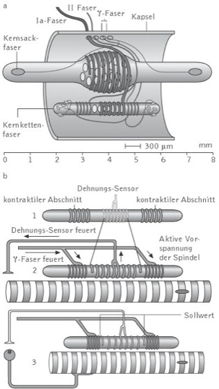 Muskelspindeln:a In den Muskelspindeln gibt es zwei Arten von Sensoren: die Kernsackfasern, die durch die sehr schnell leitenden Ia-Fasern mit den großen α-Motoneuronen des Vorderhorns im Rückenmark verbunden sind und die phasischen Muskelleistungen steuern, sowie die Kernkettenfasern, die über langsame IIa-Fasern mit den kleinen α-Motoneuronen des Rückenmarks verbunden sind und vermutlich die tonischen Muskeln steuern. b Bei Erregung der Spindel (1) werden ihre beiderseits des Sensors liegenden Pole kontrahiert. Dies hat die Dehnung des Sensorbereichs zur Folge (2). Das Ausmaß der Dehnung wird über Ia-Fasern zum Rückenmark gemeldet und es erfolgt als Antwort reflektorisch eine entsprechende Verkürzung des Muskels (3)