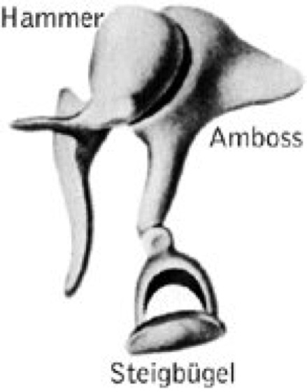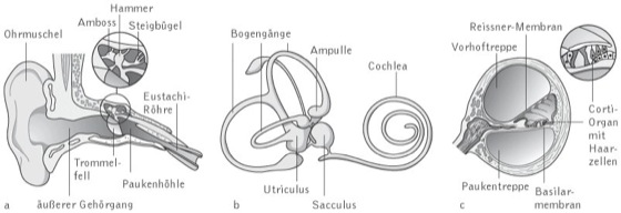 Nur bei den Säugern besteht das O. aus Außen-, Mittel- und Innenohr. Zum Außenohr zählen die bei den Tieren meist beweglichen Ohrmuscheln (Auriculae) und der Gehörgang. Funktionell können die Ohrmuscheln als Richtantennen aufgefasst werden, deren Effizienz durch Beweglichkeit noch gesteigert wird; außerdem wird durch ihre paarige Anordnung und Lokalisation am Kopf häufig ein sehr genaues Richtungshören ermöglicht ( vgl. Abb. ). Der Gehörgang (Meatus acusticus externus), der zum Mittelohr hin vom Trommelfell (Membrana tympani) begrenzt wird, dient der Schallleitung. In der Wand des Gehörgangs liegen die Ohrenschmalzdrüsen (Glandulae ceruminiferae), die das Ohrenschmalz (Cerumen) absondern. Dieses bindet eingedrungene Schmutzpartikel und sorgt für die Aufrechterhaltung der Elastizität des Trommelfells. Das Mittelohr (Paukenhöhle) ist ein luftgefüllter Hohlraum im Felsenbein, in dem sich die Gehörknöchelchen Hammer (Malleus), Amboss (Incus) und Steigbügel (Stapes) ( vgl. Abb. ) befinden. Über die Eustachi-Röhre (Ohrtrompete) steht das Mittelohr mit der Rachenhöhle in Verbindung, wodurch ein Druckausgleich zwischen Mittelohr und Außenwelt ermöglicht wird (z.B. bei schneller Überwindung großer Höhenunterschiede). Das mit Perilymphe und Endolymphe gefüllte Innenohr wird durch das ovale Fenster (dorsaler Perilymphraum, Vorhoftreppe oder Scala vestibuli) und das runde Fenster (ventraler Perilymphraum; Paukentreppe oder Scala tympani) vom Mittelohr getrennt. Zum Innenohr selbst zählen das Gleichgewichtsorgan (Labyrinth und die Maculaorgane) und die Schnecke (Cochlea) mit dem Corti-Organ. Dessen auf der Basilarmembran lokalisierte Rezeptoren (Haarzellen) setzen die aufgenommenen Schallwellen in elektrische Impulse um. Diese werden über den Nervus statoacusticus verschiedenen Kerngebieten des Gehirns zugeleitet, wobei die genaue Analyse von Klängen oder Lauten wie auch die Richtungslokalisation zu einem großen Teil neurale Leistungen darstellen.