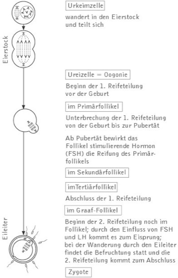 Oogenese, Eireifung, Entwicklung der weiblichen Keimzellen (Gameten) bei Tieren und Mensch. Die O. vollzieht sich in drei charakteristischen Phasen. 1) In der Vermehrungsphase, die bei Säugern bis zur Geburt dauert, entstehen durch vielfache Teilungen der Keimbahnzellen (Urkeimzellen) im Eierstock Oogonien (Ureizellen, beim Menschen etwa 400000), die sich ihrerseits durch Mitose vermehren. 2) In der Wachstumsphase kommt es zum Abschluss der Zellteilungen; die Oogonien wachsen, häufig unter Einlagerung von Dottersubstanzen, zu den wesentlich größeren Oocyten (Eimutterzellen) heran und sind meist von einer ein- (z.B. Insekten) bis mehrschichtigen (Mensch) Follikelzellschicht umschlossen. Die Wachstumsphase kann Tage (Drosophila) oder Monate (Mensch) dauern. Die Oocyte tritt meist in ein Ruhestadium ein und bedarf der Eiaktivierung. Der Übergang vom Oogonium zur Oocyte I. Ordnung wird durch Eintreten in die meiotische Chromosomenpaarung oder durch Abschluss des Wachstums definiert. Beim Menschen verharren alle Oocyten I (bei der Geburt 700000 bis 2 Mio.) von der Geburt bis zur Pubertät in Ruhe. Da in den Jahren vor der Geschlechtsreife die Mehrzahl der Oocyten degeneriert und abstirbt, sind zu Beginn der Pubertät nur noch etwa 40000 vorhanden. 3) In der Reifungsphase (Eireifung) geht die (diploide) Oocyte I durch die erste Reifeteilung (Meiose) in die (haploide) Oocyte II. Ordnung über, diese durch die zweite Reifeteilung in die Eizelle (Ovum). Beim Menschen treten in jedem Ovarialzyklus einige Oocyten in die zweite Reifeteilung ein, die jedoch nur bei Besamung vollendet wird. ( vgl. Abb. )