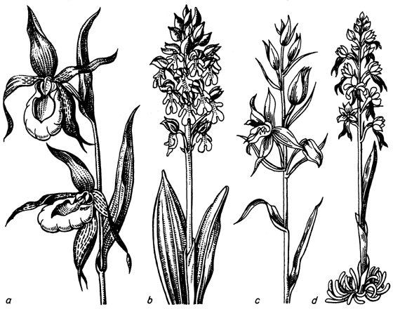 Orchidaceae:a Frauenschuh (Cypripedium calceolus), b Purpurknabenkraut (Orchis purpurea), c Rotes Waldvöglein (Cephalanthera rubra), d Nestwurz (Neottia nidus-avis)