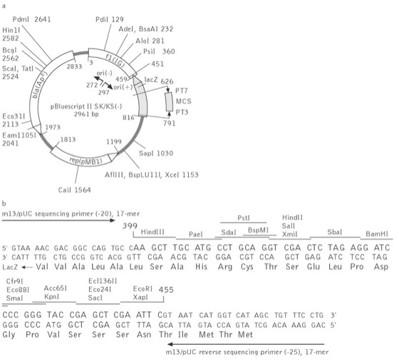 Plasmid:a Schematische Darstellung eines häufig als Klonierungsvektors verwendeten Plasmids. Die Lage von Genen wie das Ampicillin-Resistenzgen (ApR) sind als Pfeile dargestellt. MCS = Polylinker, ori = Replikationsursprung, Als weitere Information sind Schnittstellen von Restriktionsenzymen (z.B. ScaI, PdiI) außerhalb des Polylinkers angegeben. Zahlen bezeichnen Entfernungen in bp. b Schematische Darstellung eines Polylinkers mit den im Plasmid nur einmal schneidenden Restriktionsenzymen, die für Klonierungen von großem Nutzen sind