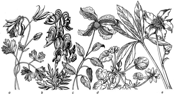 Ranunculaceae:a Akelei (Aquilegia vulgaris), b Blauer Eisenhut (Aconitum anglicum = Aconitum napellus), c Gartenclematis (Hybride aus Clematis viticella und Clematis lanuginosa), d Scharbockskraut (Ranunculus ficaria), e Schneerose (Helleborus niger)
