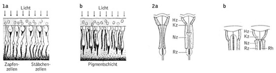 Retinomotorik:1 Schnitt durch die Retina eines Weißfischs, a bei Helladaptation, b bei Dunkeladaptation. 2a Retinomotorik beim Superpositionsauge vieler Käfer und Schlammfliegen, b beim Appositionsauge einiger Kurzflügler und Wanzen (links jeweils dunkeladaptiert, rechts helladaptiert). Hz Hauptpigmentzelle, Kz Kristallkegelzelle, Nz Nebenpigmentzelle, Rh Rhabdomer, Rz Retinulazelle