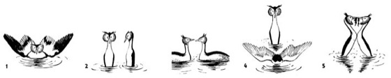 Ritualisierung: Paarungsrituale des Haubentauchers (Podiceps cristatus). Ausschnitt aus einer Handlungskette. 1 Das Männchen präsentiert die Flügel vor dem Weibchen, 2 taucht anschließend unter und richtet sich auf; 3 Männchen und Weibchen schütteln die Köpfe; 4 das Weibchen breitet vor dem aufgerichteten Männchen die Flügel aus; 5 Tanzen der beiden Partner mit Auftauchen, Aufrichten und Berühren; dazu werden Wasserpflanzen präsentiert