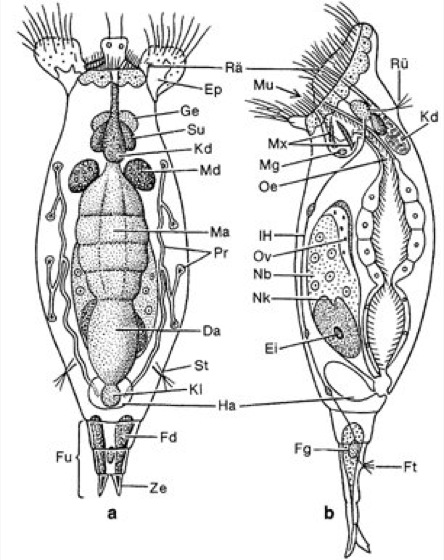 Rotatoria: Organisationsschema eines Rädertieres, a Ventral-, b Seitenansicht. Da Darm, Ei Eizelle, Ep Epidermiswulst, Fd Fußdrüse, Fg Fußganglion, Ft Fußtaster, Fu Fuß, Ge Gehirn, Ha Harnblase, Kd Klebdrüse, Kl Kloake, lH linker Hauptnerv, Ma Magen, Md Magendrüse, Mg Mastaxganglion, Mu Mund, Mx Mastax mit Kauer, Nb Nährbezirk, Nk Nährkanal, Oe Ösophagus, Ov Ovar mit Keimlager, Pr Protonephridialsystem, Rä Räderorgan, Rü Rückentaster, St Seitentaster, Su Subcerebraldrüse, Ze Zehe