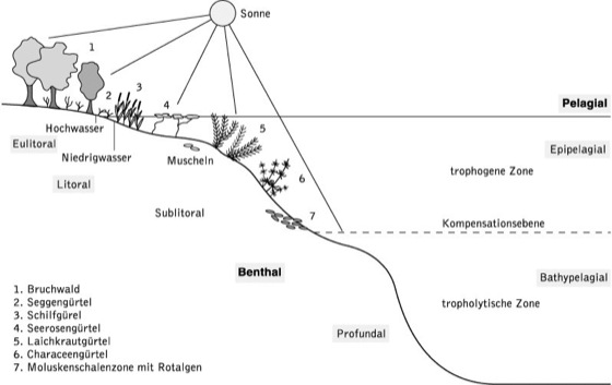 S. zeigen i.d.R. sowohl hinsichtlich physikalischer und chemischer Variablen als auch in Bezug auf verschiedene Lebensbereiche eine deutliche vertikale Schichtung: Die Lichtintensität nimmt durch die vorhandenen Mikroorganismen und Schwebstoffe mit der Tiefe rasch ab. Man grenzt die lichtdurchflutete euphotische bzw. trophogene Zone, in der Fotosynthese möglich ist, von der lichtlosen aphotischen bzw. tropholytischen Zone ab ( vgl. Abb. ). Die Schichtung der Wassertemperatur ist besonders im Sommer gegeben und entsteht durch die Erwärmung des Oberflächenwassers durch die Sonne, während das kalte Wasser in der Tiefe verbleibt. Die warme Oberschicht, das Epilimnion wird durch die Sprungschicht, das Metalimnion oder Thermokline von der kalten Grundschicht, dem Hypolimnion getrennt. Im gemäßigten Klimabereich findet i.d.R. zweimal jährlich eine so genannte Vollzirkulation oder Holomixis statt. Sowohl im Frühjahr als auch im Herbst kommt es durch den Wind und bei gleichmäßiger Wassertemperatur von ca. 4 °C zu einer Durchmischung des Wassers und zu einer Umverteilung von Sauerstoff und Nährsalzen. Den stabilen Zustand der Schichtung im Sommer und im Winter bezeichnet man als Stagnation, einen See mit einem solchen Zirkulationstypus als dimiktisch. ( vgl. Abb. )