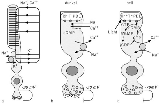 Die Fotosensoren haben im Dunkeln durch einen ständigen, im Vergleich zu anderen Zellen erhöhten Na+-Ca2+-Einstrom ein vergleichsweise etwas niedrigeres Ruhemembranpotenzial von – 30 mV. Dies ist darauf zurückzuführen, dass die Natrium-Kanäle der äußeren Stäbchenmembran durch je drei Moleküle cGMP (Guanosinphosphate) etwas offen gehalten werden und daher dauernd Na+-Ionen in die Zelle eindringen können; gleichzeitig strömt eine entsprechende Menge K+-Ionen aus der Zelle heraus und ist als Dunkelstrom messbar. Die Konformationsänderung des Rhodopsins nach Einfangen eines Lichtquants führt zur Verminderung der Durchlässigkeit der äußeren Stäbchenmembran für Na+- und Ca2+-Ionen und somit zu einer Hyperpolarisation der Stäbchenmembran auf bis zu – 70 mV. Ein durch Licht aktivierter Rhodopsin-Komplex aktiviert nun rund 500 G-Proteine (hier Transducine genannt), die mit je 500 Phosphodiesterasen (PDE) gekoppelt sind. Diese hydrolyisieren cGMP, das als second messenger dient, zum 5'-GMP und zwar hydrolysiert jedes PDE-Molekül rund 2000 cGMP-Moleküle, sodass durch den beschriebenen Prozess der Signaltransduktion ein Verstärkungseffekt von 1:106 erreicht wird. Die abnehmende Konzentration von cGMP-Molekülen führt nun zur Schließung der Na+-Kanäle und als Folge zur bereits beschriebenen Hyperpolarisation. Diese führt auch zu einer verminderten Ausschüttung von Transmittersubstanzen an den Synapsen der Fotosensoren ( vgl. Abb. ). Hierauf reagieren wiederum die nachgeordneten Neuronen, die Bipolarzellen.