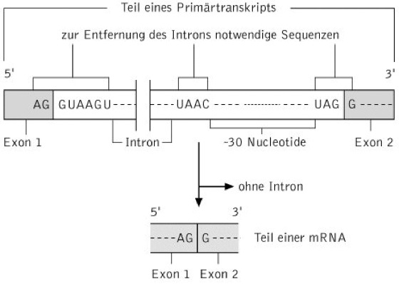 Spleißen, engl. splicing, Bez. für das Herausschneiden von Introns aus der hnRNA (Primärtranskript), sodass für die Translation geeignete messenger-RNAs entstehen. Das S. ist ein Teilschritt während der Prozessierung eukaryotischer Transkripte und kommt auch bei ribosomaler RNA und transfer-RNA vor. Für das korrekte S. dienen konservierte Nucleotidsequenzen (Consensussequenzen), die den Übergang von Exons und Introns kennzeichnen ( vgl. Abb. ). Bei Genen, die für Proteine codieren, bezeichnet man die Introns als so genannte GT-AG-Introns, da am 5'-Ende auf DNA-Ebene die Nucleotide GT und am 3'-Ende AG vorkommen.