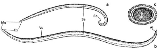 Spulwurm:a Männchen, b Weibchen und c Ei. Af After, Ei Ei (optischer Schnitt), ca. 60μm lang, mit artspezifischer Runzelung der äußeren Hülle, Ex Exkretionsporus (ventral), Mu Mund, Se Seitenlinie (durchscheinende laterale Hypodermisleiste), Sp die aus der Kloake herausragenden Spicula am eingekrümmten Schwanz des Männchens, Vu Vulva