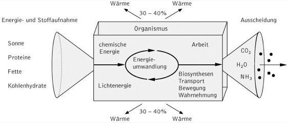 Stoffwechsel: Lebende Organismen stehen mit ihrer Umgebung in einem Fließgleichgewicht. Energie wird aus der Umgebung in Form von Lichtenergie (fototrophe Organismen) oder als chemische Energie (chemotrophe Organismen) aufgenommen und in ATP umgewandelt. Die so gespeicherte Energie kann für verschiedenste Arbeitsleistungen der Zelle verwendet werden. Bei der Speicherung und der Nutzung der aufgenommenen Energie treten Energieverluste in Form von abgegebener Wärme von 30 bis 40 % auf. Die aufgenommenen Substrate werden z.T. auch als Biosynthesevorstufen genutzt, Abfallstoffe werden ausgeschieden