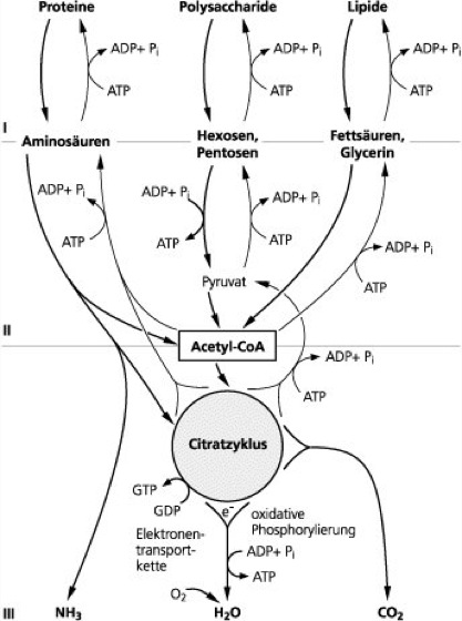 Stoffwechsel: Anabole und katabole Stoffwechselwege können in drei Stufen unterteilt werden. Im Katabolismus werden in Stufe I die Makromoleküle zunächst zu Monomeren abgebaut. Anschließend werden diese in Stufe II zu kleineren Einheiten abgebaut, die eine zentrale Rolle im Stoffwechsel spielen (Pyruvat, Acetyl-Coenzym A oder Zwischenprodukte des Citratzyklus). Bereits hier wird etwas Energie in Form von ATP gewonnen. Stufe III besteht aus dem Citratzyklus und der oxidativen Phosphorylierung in der Atmungskette. Hier erfolgt die vollständige Oxidation zu H2O und CO2, wobei im Vergleich zu Stufe II große Mengen ATP synthetisiert werden. Die anabolen Stoffwechselwege verwenden Zwischenprodukte des Citratzyklus und der Glykolyse als Ausgangssubstrate und synthetisieren daraus unter Energieverbrauch Monomere und in Stufe I unter weiterem Verbrauch von ATP die benötigten Makromoleküle