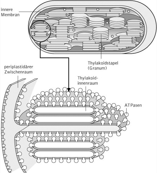 Thylakoide, das Endomembransystem der Chloroplasten, in dem die fotosynthetischen Lichtreaktionen ablaufen. Ihre Membranen enthalten deshalb auch Chlorophylle und Carotinoide als Fotosynthesepigmente. Der Begriff T. wird auch für die intracytoplasmatischen Membranen von Cyanobakterien und fototrophen Bakterien verwendet. Die T. der Chloroplasten leiten sich von der inneren Hüllmembran ab, stehen mit dieser jedoch nicht mehr in Verbindung, sodass sie als dritte plastidäre Membran aufgefasst werden können. Sie liegen entweder einzeln im Stroma (Stromathylakoide) oder aber zu mehreren Membranstapeln (Grana) zusmmengefasst und bilden ein von der Thylakoidmembran umgebenes, geschlossenes System, dessen Inneres als Thylakoidlumen bezeichnet wird. ( vgl. Abb. ) T. unterscheiden sich in Bezug auf das Lipidmuster deutlich von pro- und eukaryotischen Plasmamembranen und der inneren Mitochondrienmembran, da sie vor allem Galactolipide und Sulfolipide enthalten. Die für die chemischen Prozesse der Lichtreaktionen erforderlichen Proteinkomplexe für den Elektronen- und Protonentransport (Fotosysteme PS I und PS II, Cytochrom b6f-Komplex, ATPase) und die Elektronen übertragenden Proteine (Plastochinon) sind größtenteils integrale Bestandteile der T.-Membran. Dabei kommt es wie bei anderen Energie konservierenden Membranen (z.B. Mitochondrien) auch zu einer vektoriellen Anordnung in der Membran, sodass bestimmte Prozesse nur an der Stromaseite, andere hingegen an der dem Lumen zugewandten Seite ablaufen.