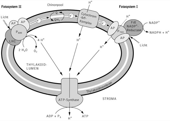 Thylakoide: Die Anordnung der Elektronentransportkette in der Thylakoidmembran. Am Fotosystem II wird das einfallende Licht von Antennenpigmenten (AP) und vom Lichtsammelkomplex (LHC von engl. light harvesting complex) gesammelt und zum Reaktionszentrum P680 weitergeleitet. Dort wird H2O unter Einwirkung von Licht gespalten und dabei O2 gebildet und Protonen freigesetzt. Die Elektronen werden über den Chinonpool zum Cytochrom-bf-Komplex transportiert und weitere Protonen vom Stroma in das Thylakoidlumen gepumpt. Im Fotosystem I findet die zweite Lichtreaktion statt, wobei das Licht von Antennenpigmenten zum Reaktionszentrum P700 geleitet wird. Die Elektronen werden auf NADP+ übertragen, das dabei zu NADPH reduziert wird. Auch dieser Prozess führt zur Einschleusung von Protonen aus dem Stroma ins Thylakoidlumen. Das so aufgebaute elektrochemische Potenzial über die Thylakoidmembran wird zur Synthese von ATP genutzt
